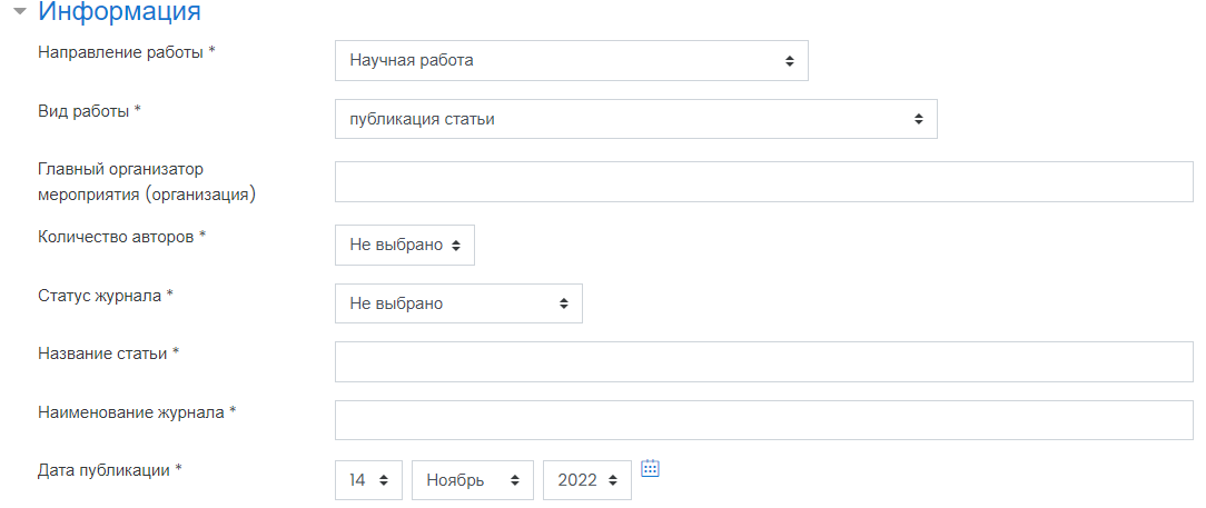Для добавления достижения на открывшейся странице необходимо нажать кнопку «Добавить достижение», после чего на странице появится форма для заполнения. Для добавления информации необходимо выбрать «Направление работы», а затем «Вид работы», например «Научная работа» и «Публикация статьи» (рис. 3). После этого необходимо заполнить появившиеся поля (поля, отмеченные *, обязательны для заполнения).
